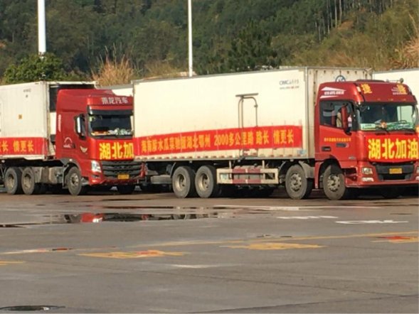 2020年2月13日,中国石化广西石油贺州分公司富罗服务区迎来了10部从海南省运输疫情防控生活物资到湖北省的卡车。每部卡车车头都贴有“湖北加油”字样,而车身右侧打着“海南水瓜菜驰援湖北鄂州,2000公里路路长情更长”的横幅。