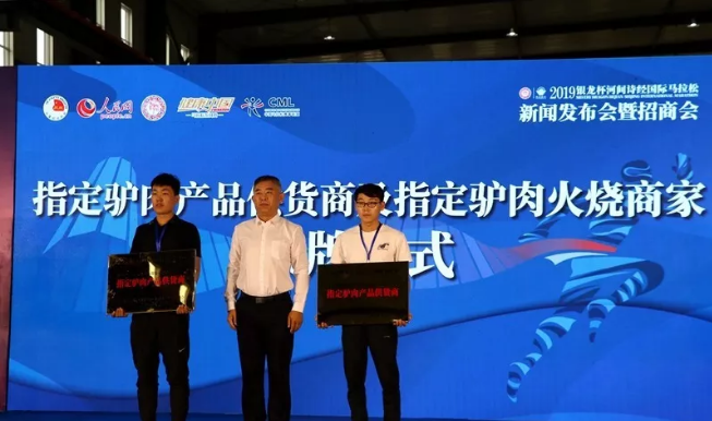 本次诗经国际马拉松特意为跑友们甄选了多家靠谱的驴肉企业作为指定商家以及供货商,授予河间市源福肉制品有限公司、河北瑞彬食品有限公司、河北乐天食品有限公司为指定驴肉产品供货商。授予李春秋驴肉火烧店 、河间市高玛纳驴肉火烧店、河间市青林全驴宴饭店为指定驴肉火烧商家。河间市委常委 政法委书记薛德培、河间市委常委 宣传部长王占强、河间市公安局局长王力分别为这六家优秀企业进行授牌。