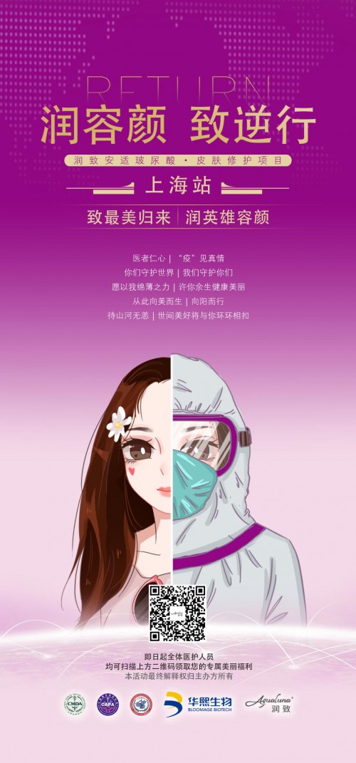 “致最美归来,润英雄容颜”。为了感恩致敬为保护国人安康,拼命奋战在抗击疫情第一线的医护人员,华熙生物与中国整形美容协会联合在济南、北京、武汉、上海、重庆、昆明、南宁、西安、银川等多个城市,相继顺利的启动了“润容颜 致逆行”全国联动性大型公益活动!据悉此次活动将以济南为中心,并采取全国联动的形式进行开展。