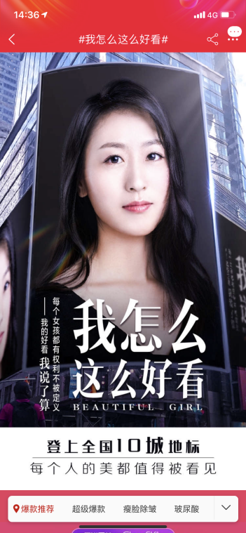记者采访到活动主办方,当被问及,为什么作为一家医美平台,反而让一个素人上大屏做宣传,阿里健康天猫医美负责人张帅表示。目前天猫医美平台数据显示,医美项目消费人群中有56%是90后。许多人有意识通过医美手段让自己变得更好看,但很多年轻人容易盲目追求“网红脸”,对“好看”的认知存在一定的错位。通过素人女孩上大屏宣言#我怎么这么好看#,是希望大家能直观感受到美有千万种,美没有唯一标准。