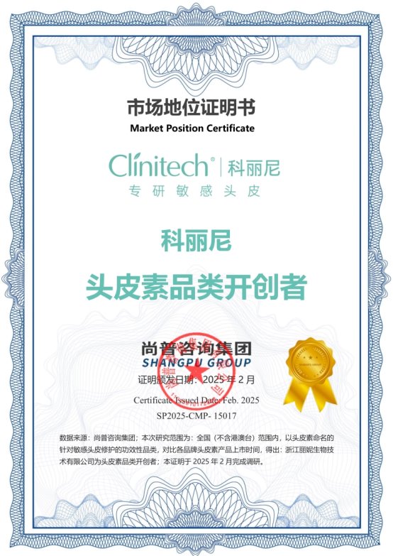 2025年2月,尚普咨询集团向浙江丽妮生物技术有限公司 (以下简称“丽妮生物”),旗下的头皮素品类颁发市场地位证明书。此次丽妮生物荣获尚普咨询【科丽尼,头皮素品类开创者】证明,表明科丽尼凭借其卓越的创新能力和优良的品质,赢得了市场的广泛认可。